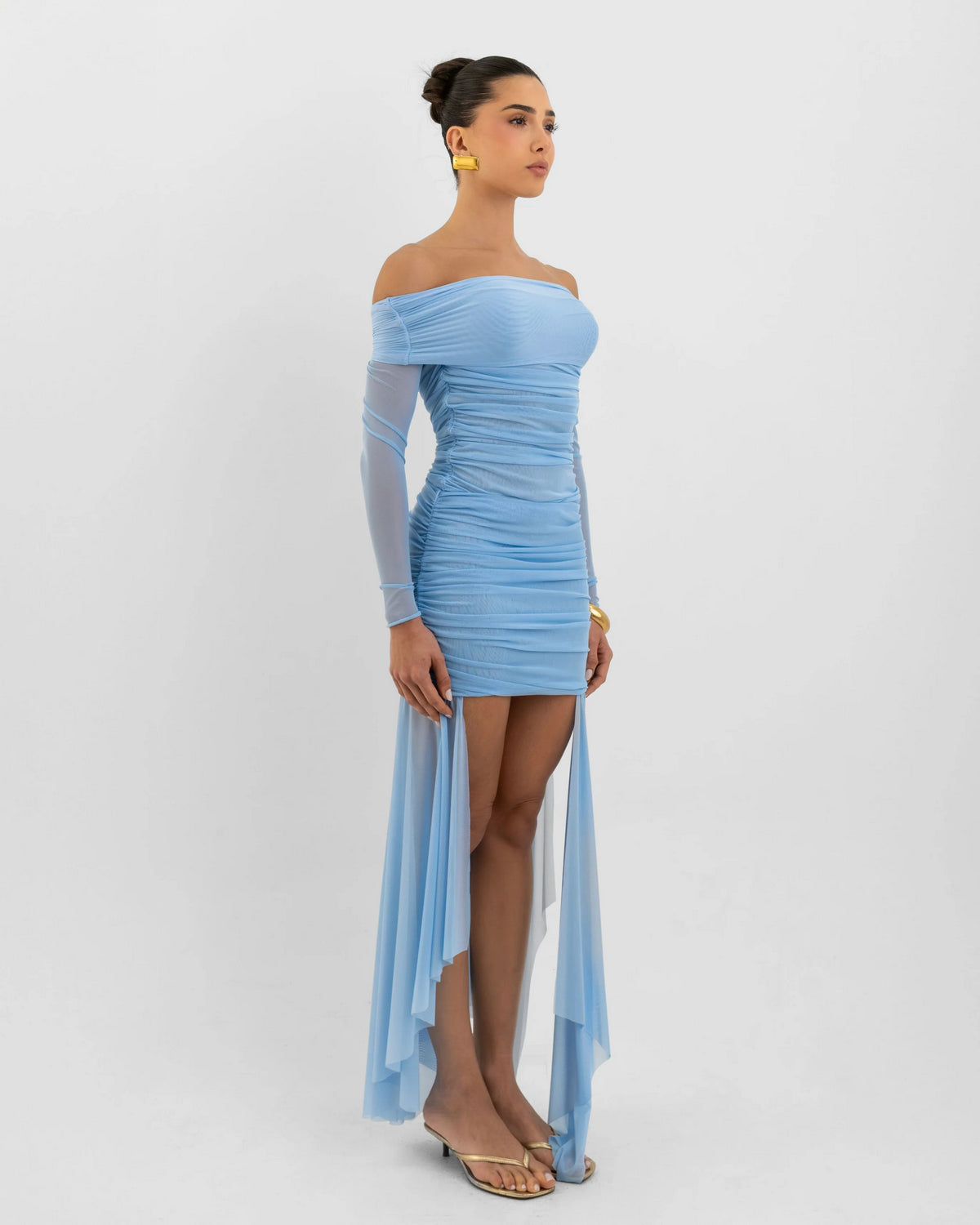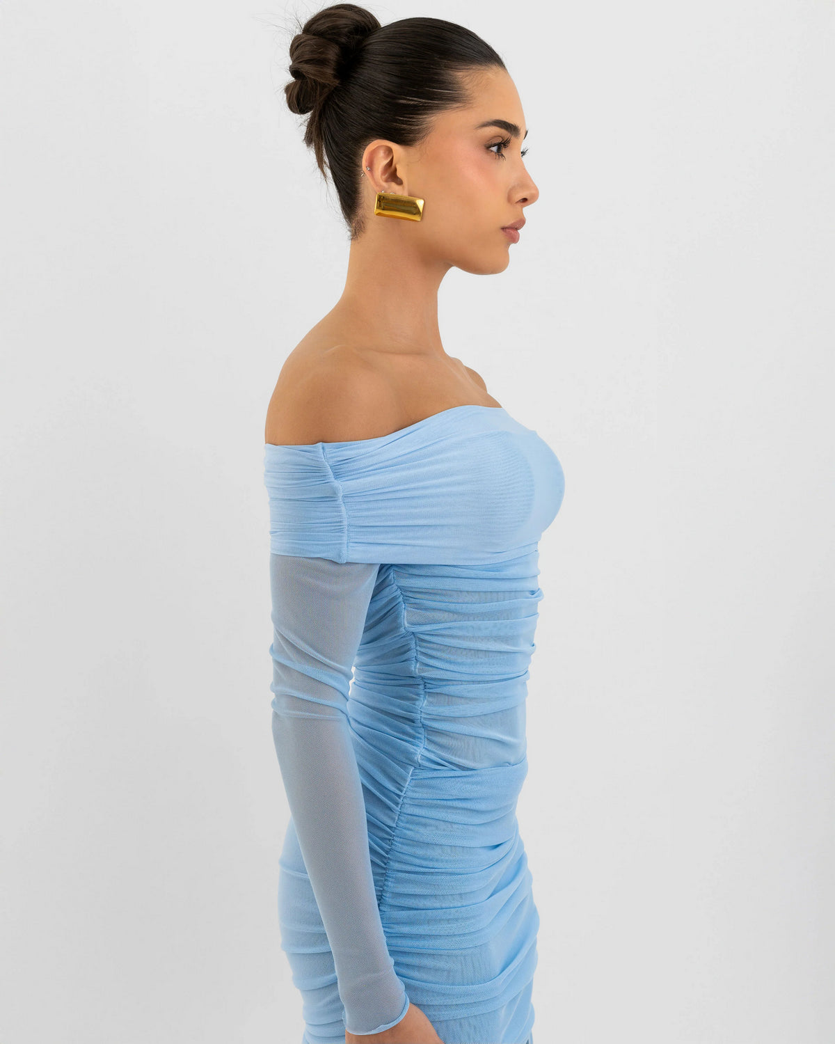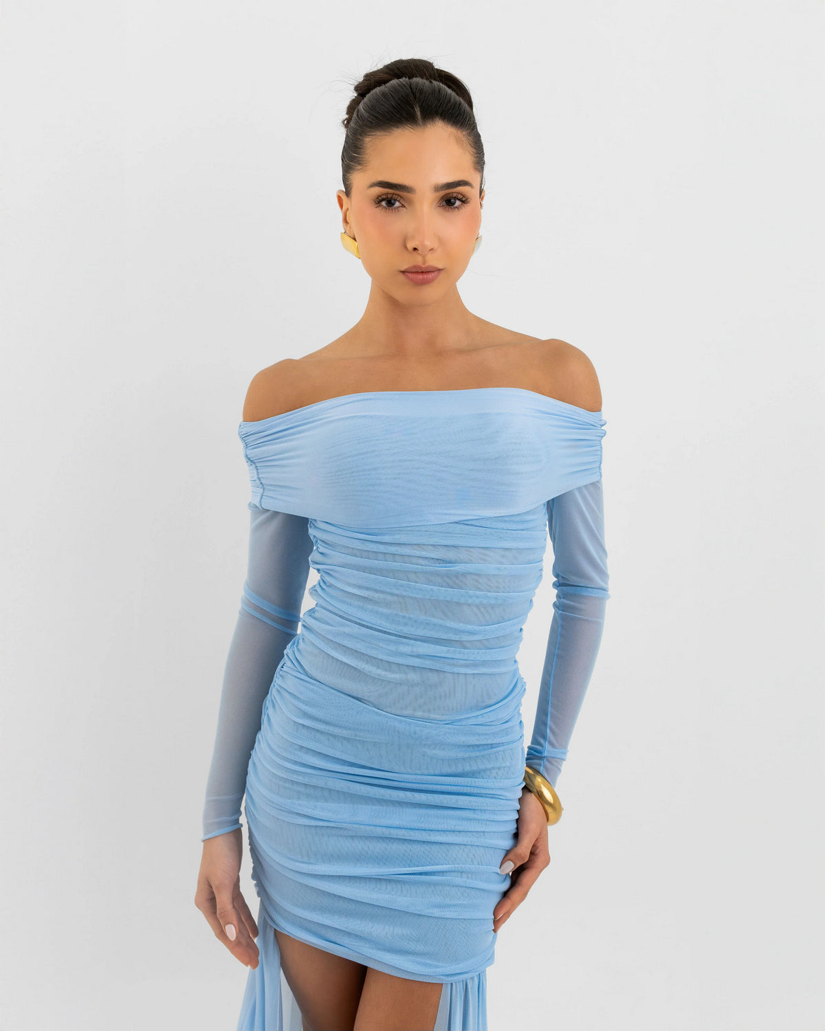 Blusa de manga larga con silueta ajustada y detalle fruncido en la parte delantera y trasera. Presenta un escote Bardot que deja al descubierto los hombros, añadiendo un toque femenino y sofisticado.