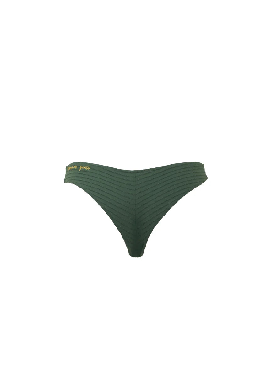 Disfruta del verano con nuestra braguita Charlotte, una prenda esencial diseñada para realzar tu silueta con su cobertura atrevida. Confeccionada en un tejido Deep Jade de textura suave, esta braguita no solo realza tu figura natural, sino que también ofrece un ajuste suave y cómodo. El exclusivo detalle "Summer Gems" bordado en dorado en la espalda añade un toque de brillo sofisticado que te hará brillar bajo el sol. Perfecta para tus escapadas de verano y momentos de la hora dorada.