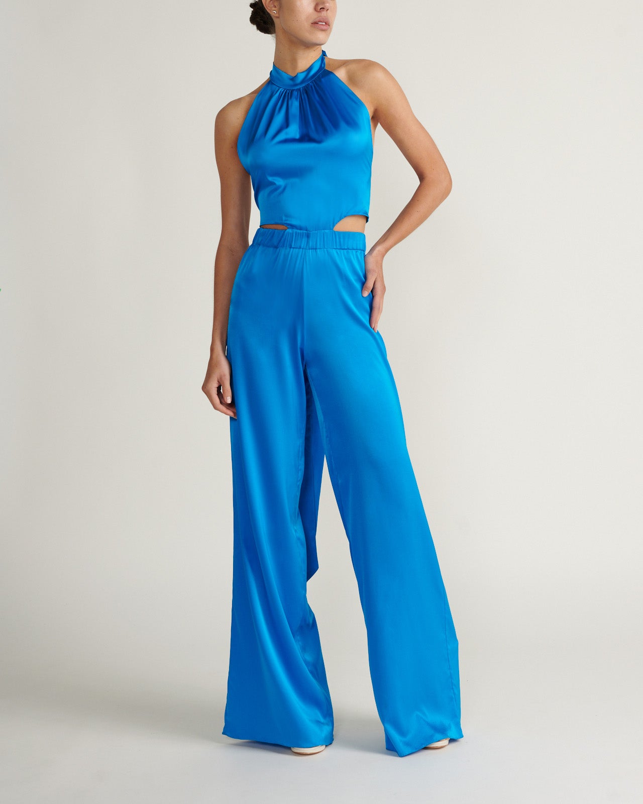 100% silk jumpsuit with a halter top for a sexy and feminine look.