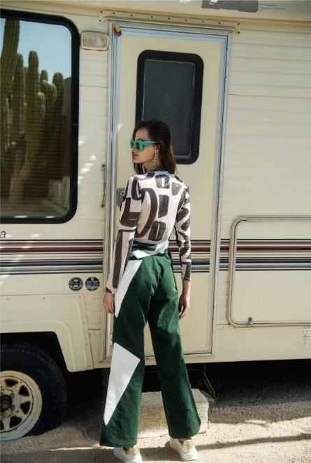 The Triangle Tango Cargo is the perfect addition to your wardrobe, offering a unique and stylish twist on traditional cargo pants. Made from a beautiful dark green cotton denim fabric, this pant is designed with a flattering fit and unique cuts, inspired by the triangles found in nature's fractals. The pockets on these pants are functional and edgy, adding a touch of utility to the sophisticated design.