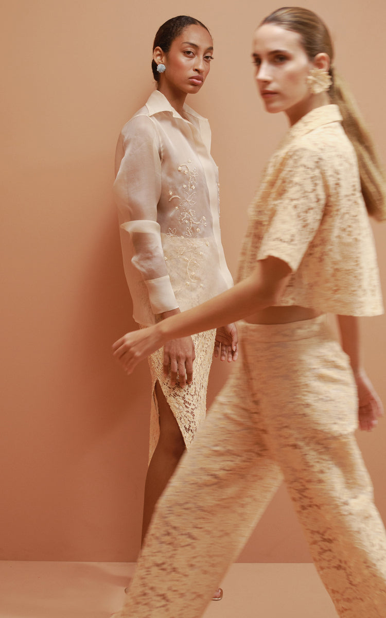 The Valen pants are a unique and sophisticated piece that will stand out on any occasion. With their hand-embroidered and French lace, these pants are a true work of art. Their unusual and exclusive design makes them the perfect garment to express your elegant and refined style.