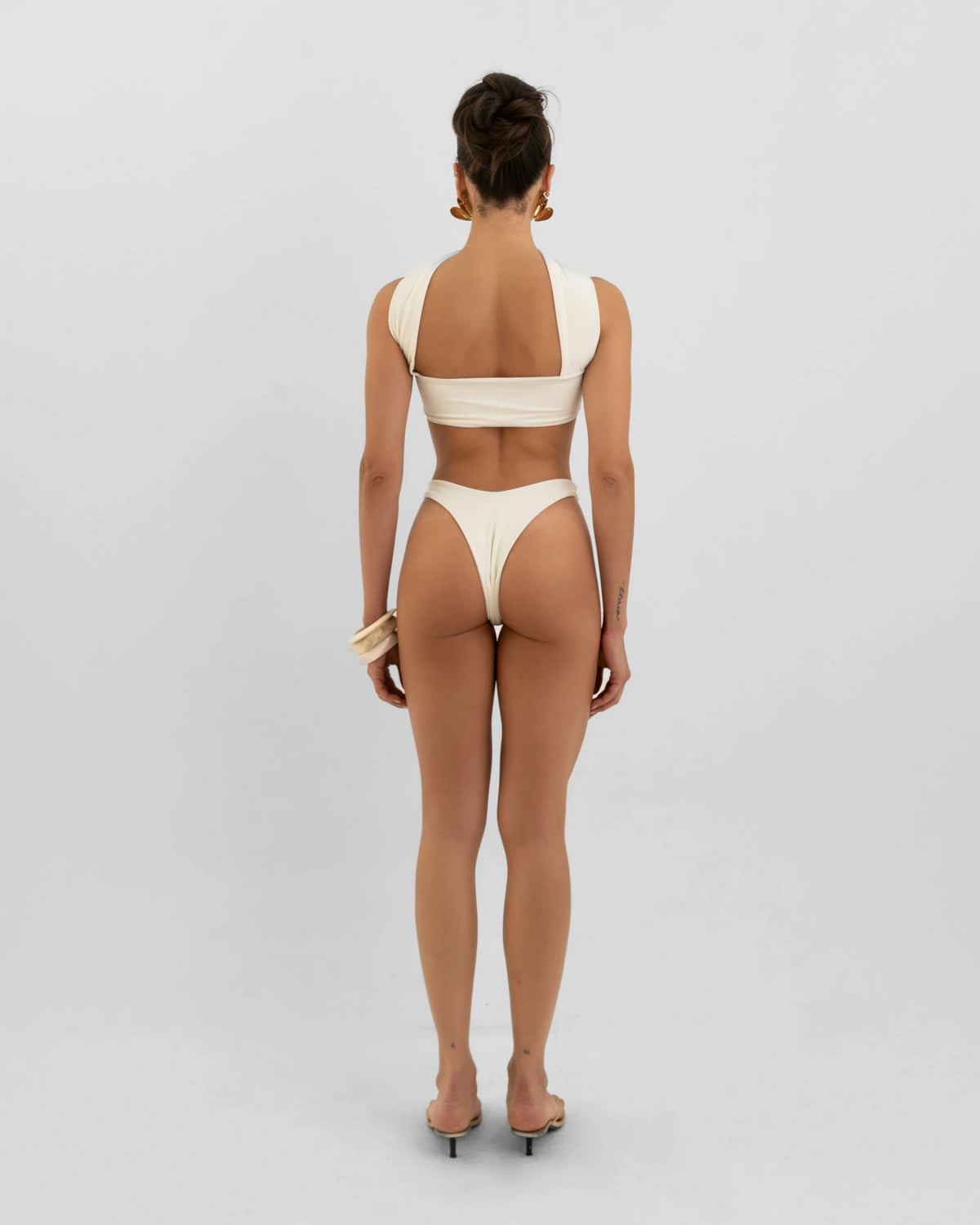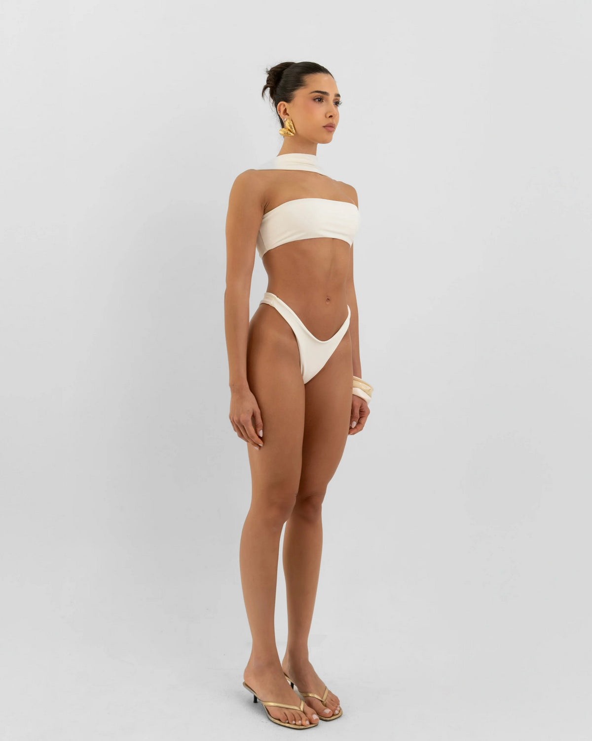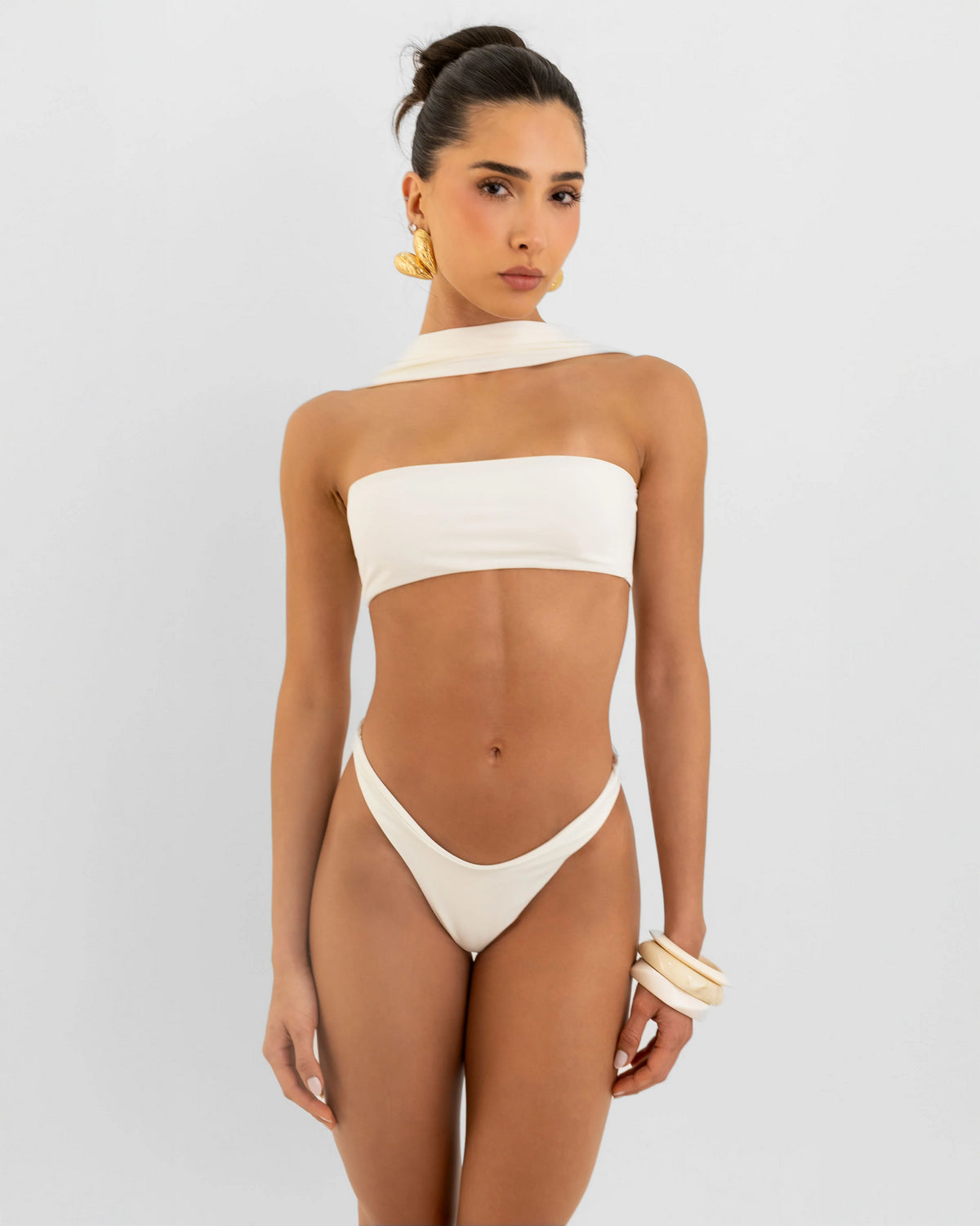Top bandeau ajustado con un único tirante alrededor del cuello. Fabricado con tejido elástico para un ajuste cómodo. Los colores muy claros pueden volverse transparentes al mojarse, dependiendo del tono de tu piel. NO se recomiendan prendas de colores claros para broncearse, ya que todas las lociones bronceadoras tienden a manchar.