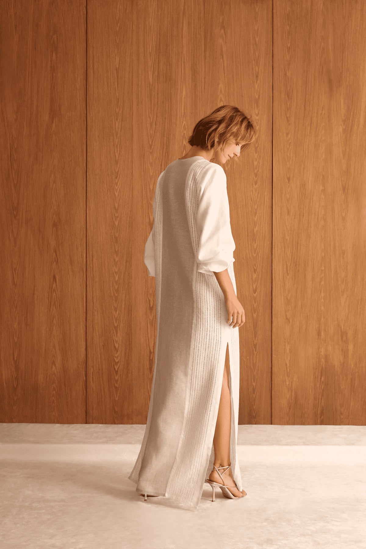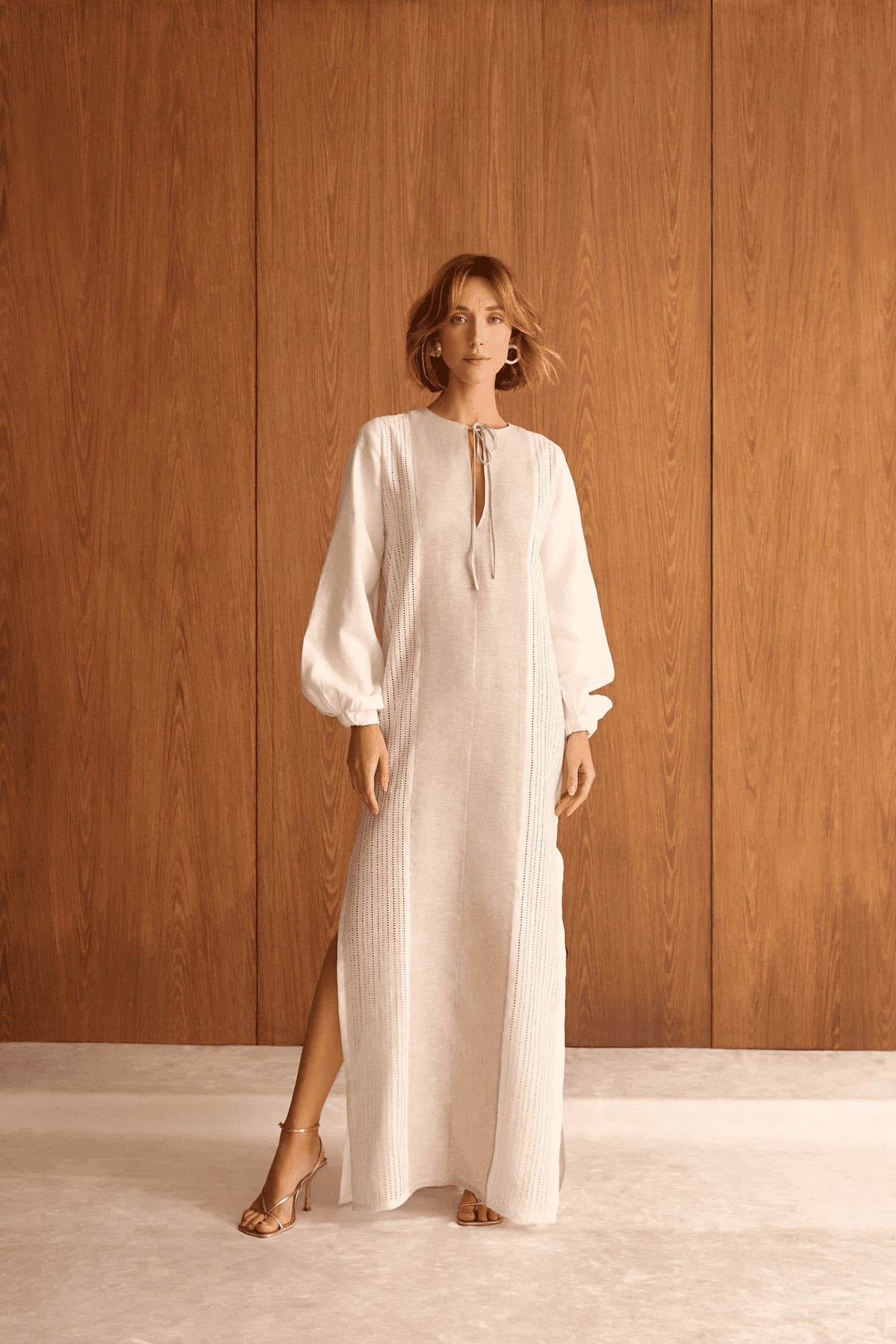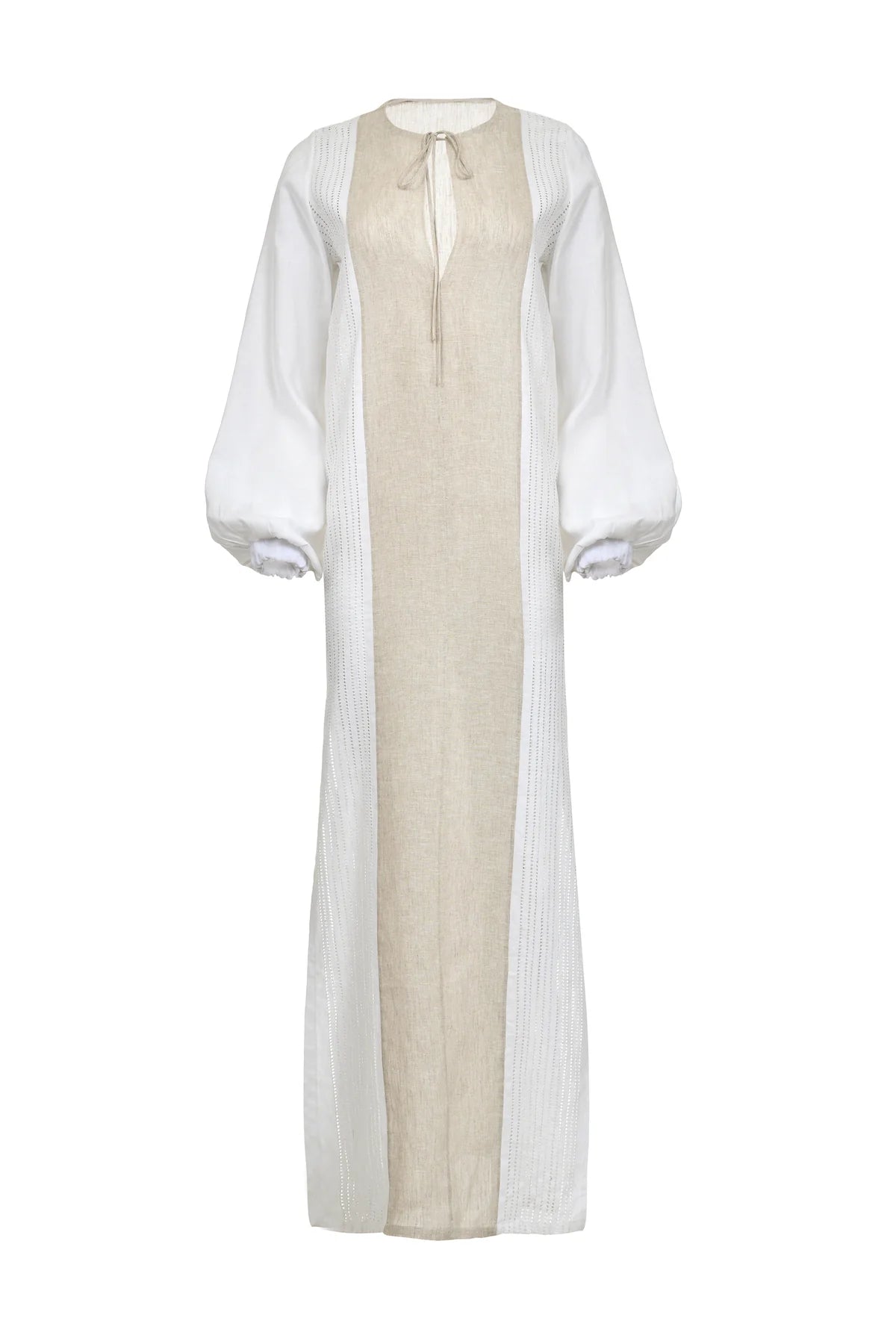 Long-sleeved 100% linen dress with oatmeal and white panels. An ideal gown for both everyday wear and special occasions. Crafted with handcrafted details, the front features eyelet detailing.
