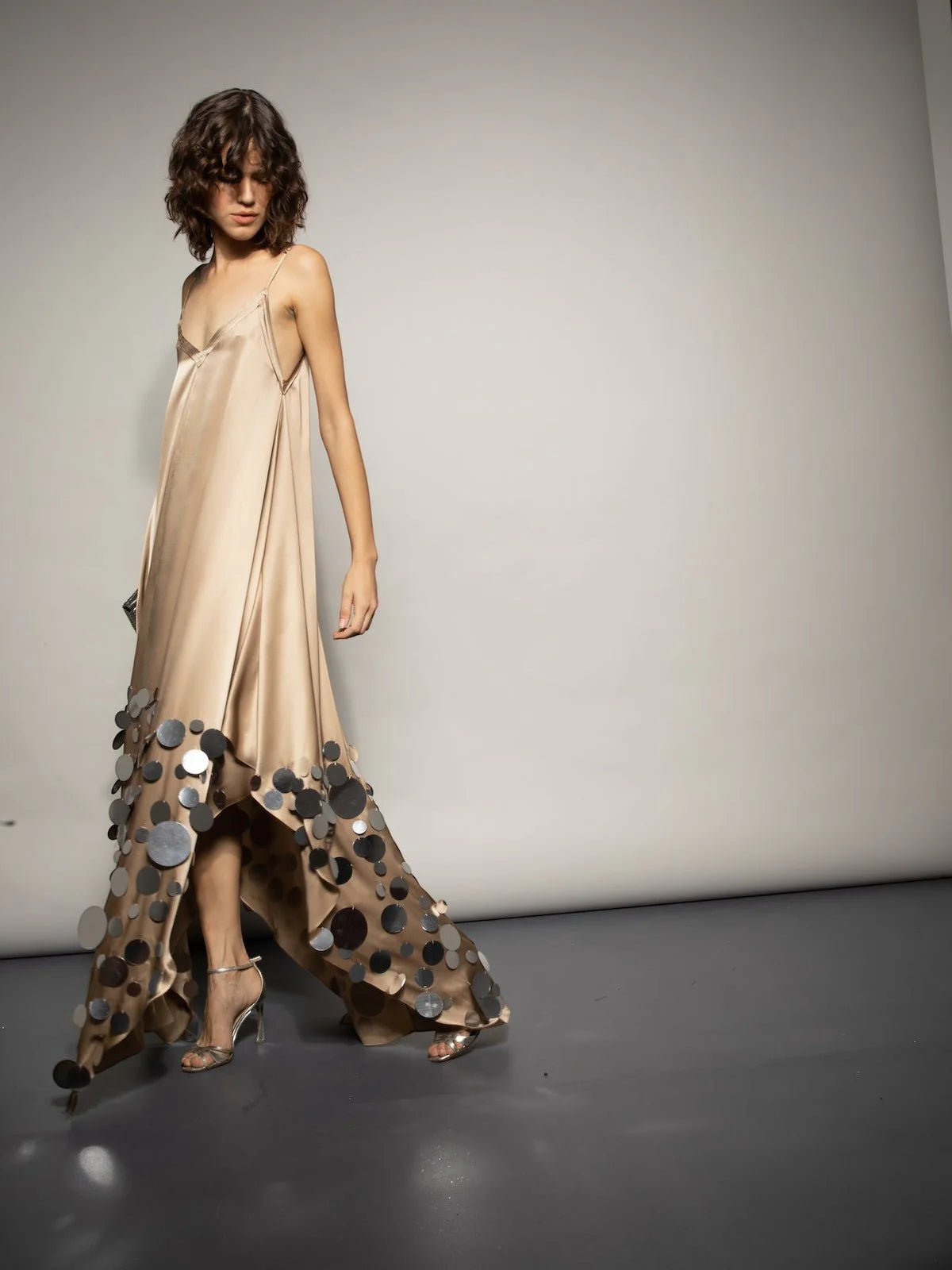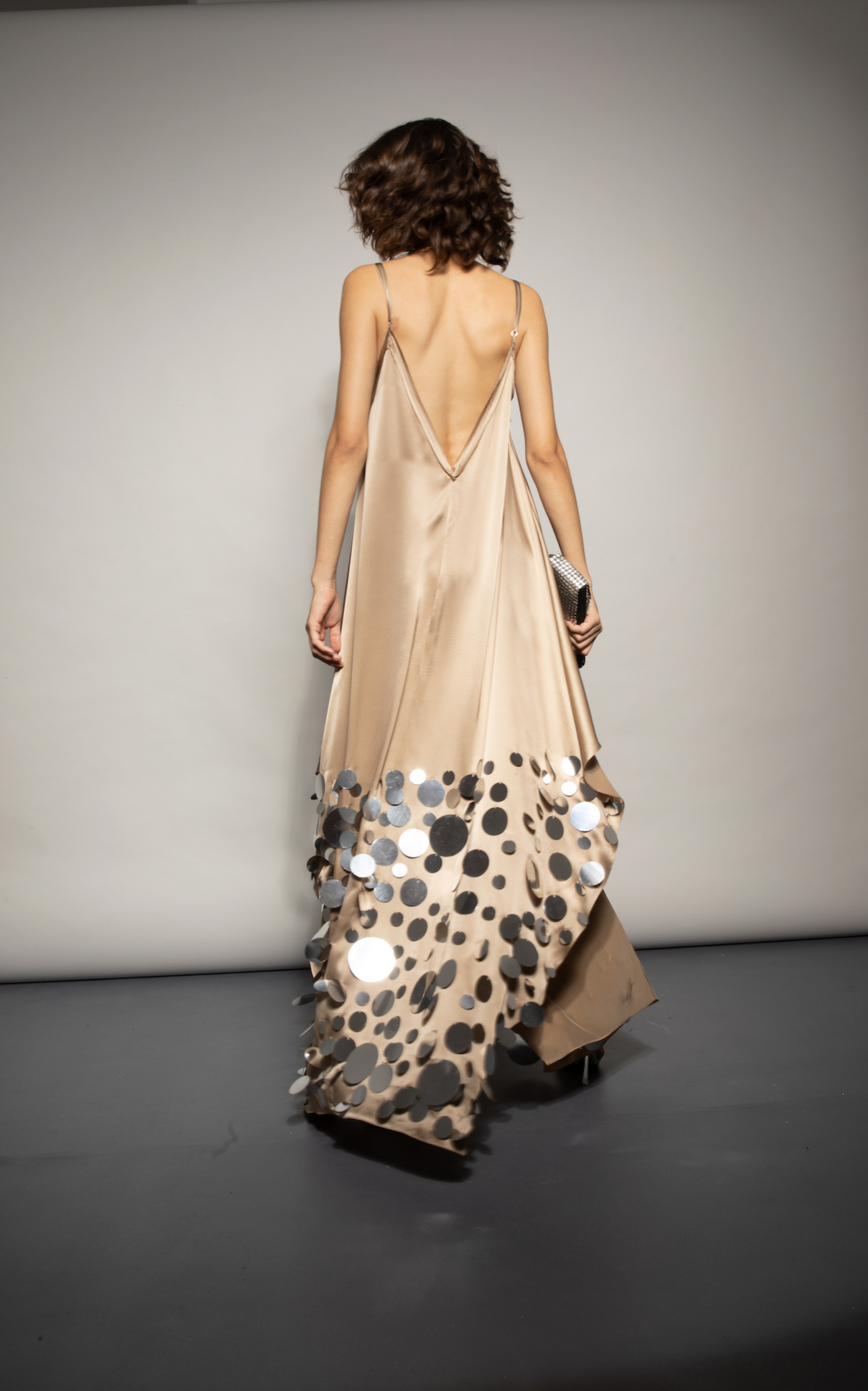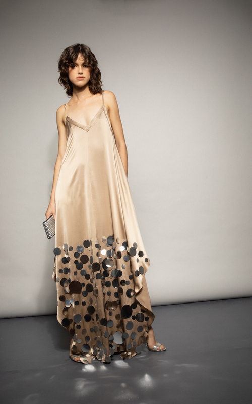 Our Francesca Miranda Tigre disco dress is a long, flowing dress with a deep V-neckline and large disco details on the lower half. The dress has a low back and thin straps. Handmade by female heads of household in Colombia.